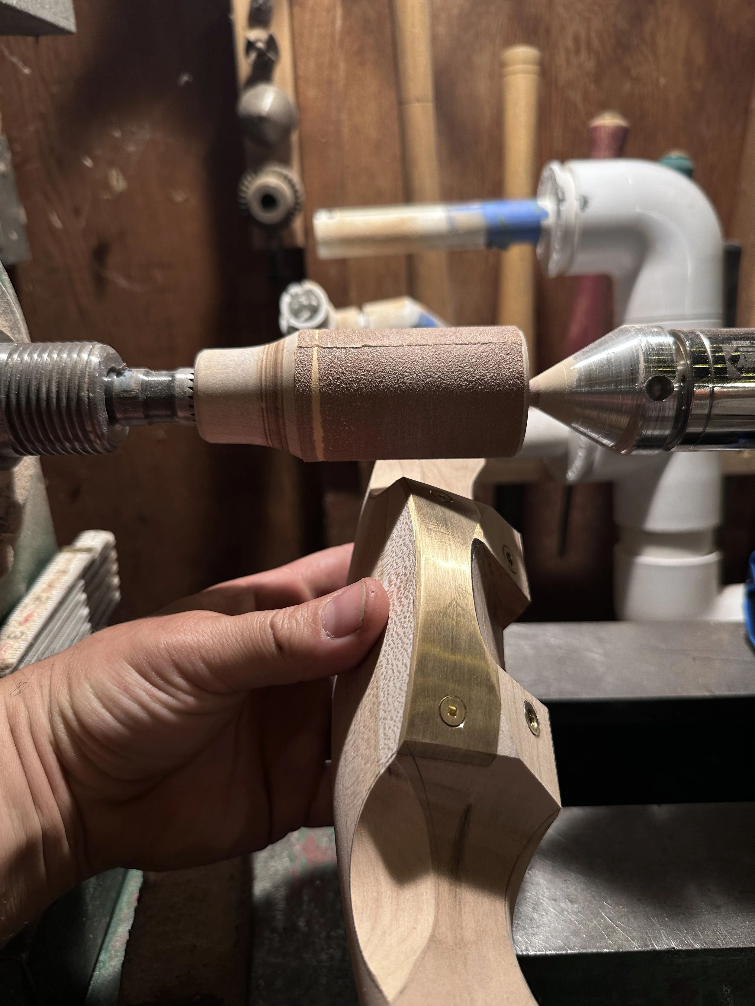 I begin by bulking out most of the material in that area with my sanding setup on the lathe. Its efficient and dusty, fast but perilous. One momentary loss in focus and you’ll have a travisher with an entirely new look and feel. What I heard Curtis Buchanan once call a, “design opportunity.” And seriously, I mean a moment of lost focus. Its amazing how difficult it can be to keep your mind trained on a single task. At times, I swear there was a saboteur in my head laying time delayed claymores. One moment I’m cooly and calmly carving a piece of cherry at 3000 rpms and next, I’m off into considerations of the tautological nature of praxeology. That’s when the mistakes happen… Thanks Mises…