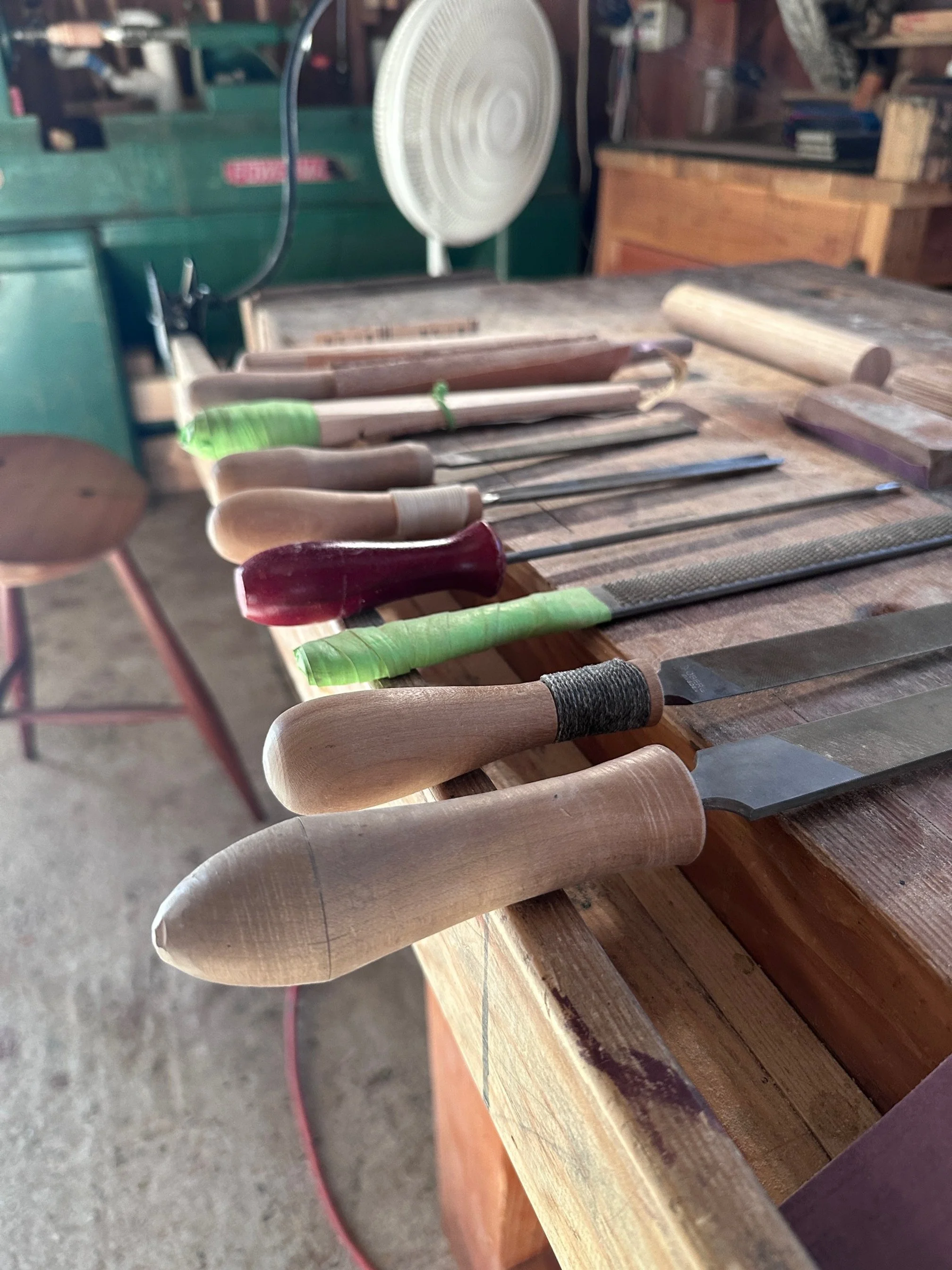 Once the bulking has been completed, I go through various stages of filing and sanding and if you haven’t tried them, the Iwasaki files from Japan they are awesome. Super sharp and actually take shavings rather than tearing out fibers pieces like a common rasp. These finger scallops have a slight convexity to them even though they look flat. So getting just the right amount of curve is important and after I’ve taken them 95% of the way with the files I use a couple dowels with 220 and 320 grit sandpaper. All of this looks pretty simple and it is but it demands patience to get it right, and that’s what I’m committed to. I want to make sure these tools not only function but are really nice.